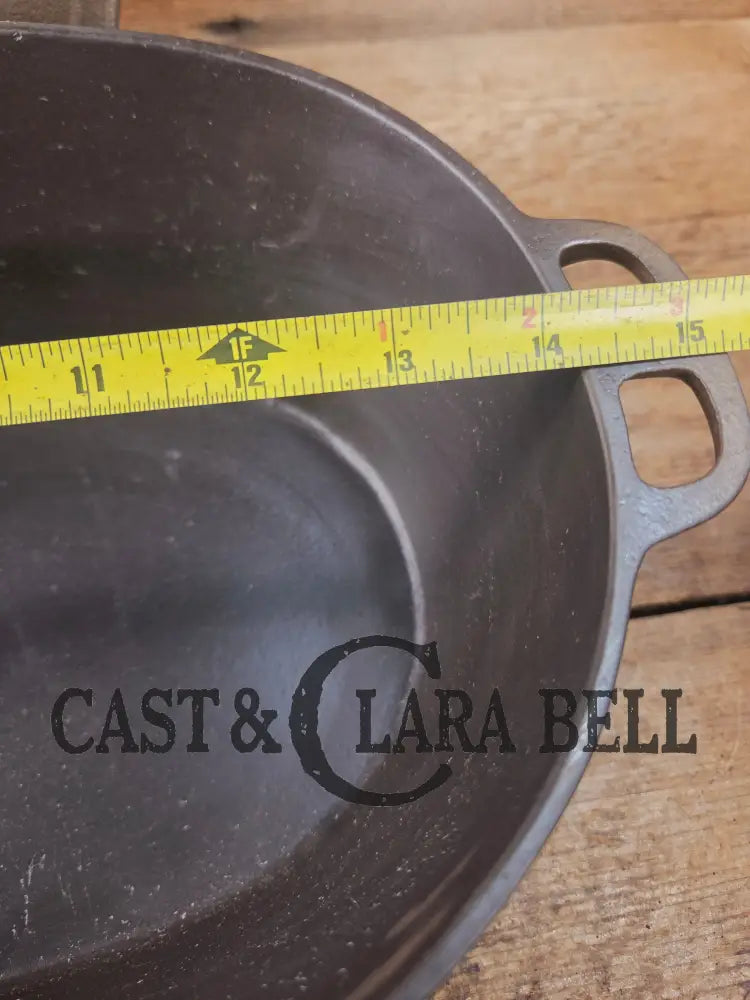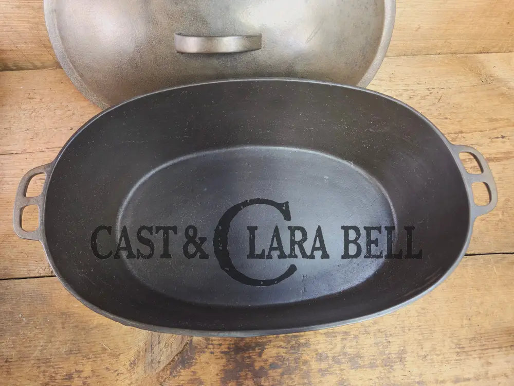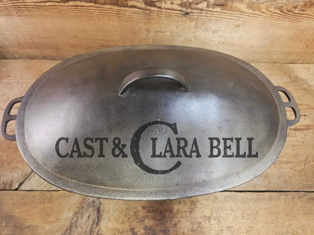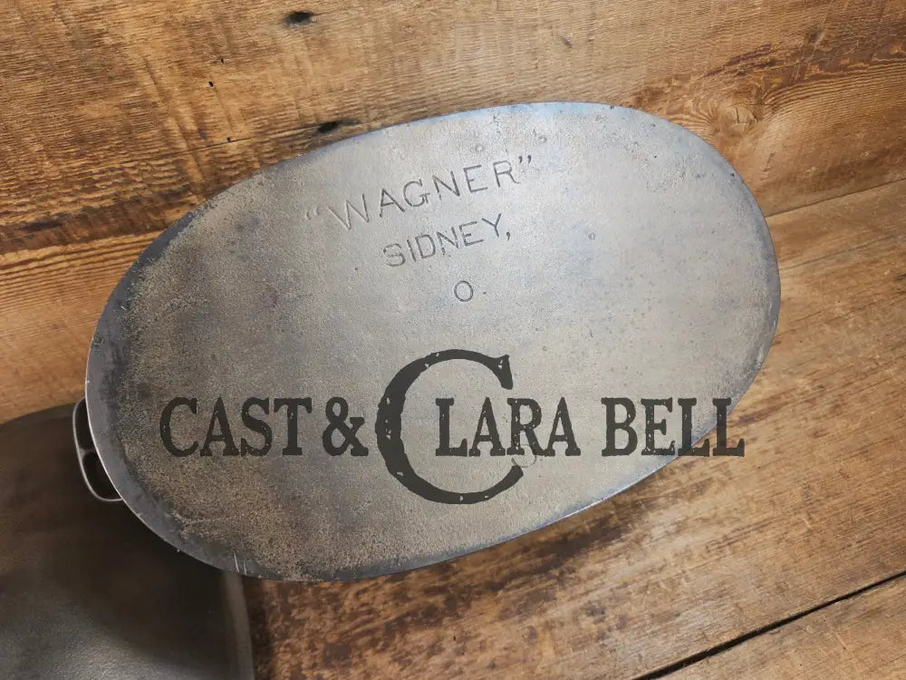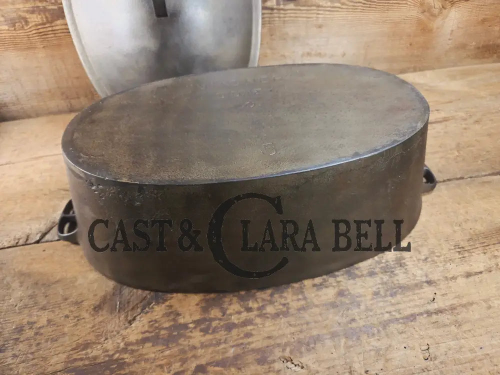 Wagner Cast Iron, made in Sidney Ohio, was known for their amazingly light and smooth cast iron cookware, and this unique #5 Oval Roaster (Dutch oven) is a great example! It's an early version of the company's Dutch oven line, where the Wagner Ware stylized logo had not yet been implemented. Called the "Block Logo", collectors know that Wagner's vintage CI is amazing to use, and the earliest versions are fantastic for everyday use. This piece has an outside nickel coating and a black iron interior.Β We love these for the unique look it gives to each and every piece.Β Sits flat!!!