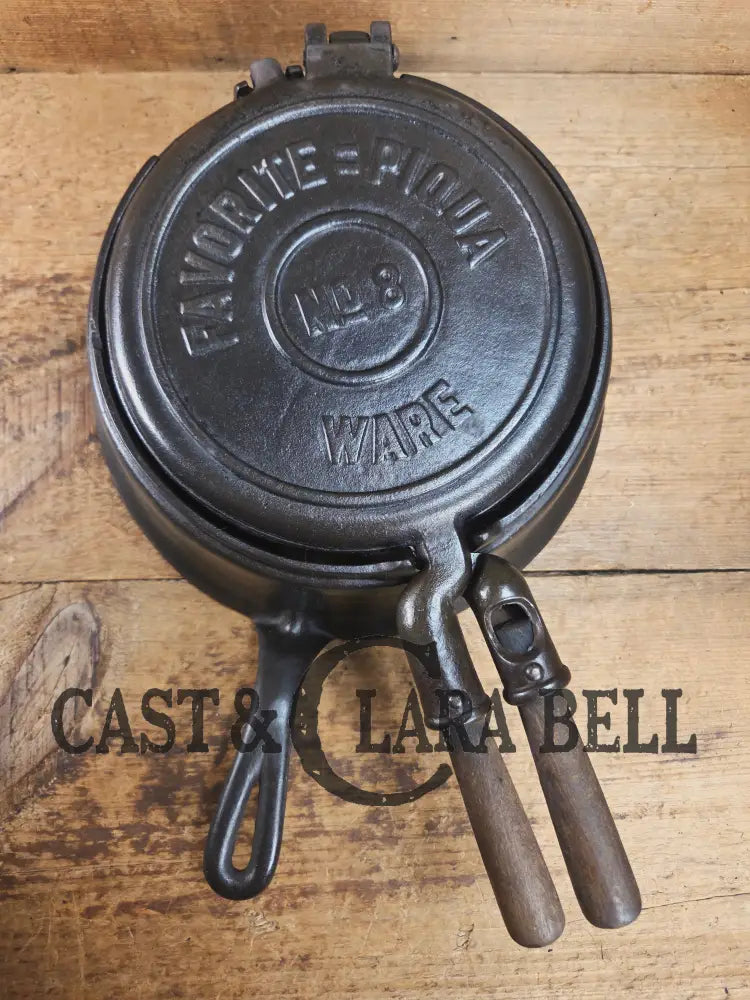 It makes wonderful waffles, but also breakfast sandwiches, ice cream sandwiches and more creative twists to the traditional! The Favorite Piqua logo shines bright and clean as its been fully restored and is ready to use! The handles are original, and can be tricky to restore being made of wood AND original rivets. When we season waffle irons we give them a heat treatment which can weaken the handles at the rivet area where they attach to the paddles. So there is invariably some carbon left right at the rivet area and the lower side of the paddle. You will see this in pics.Β