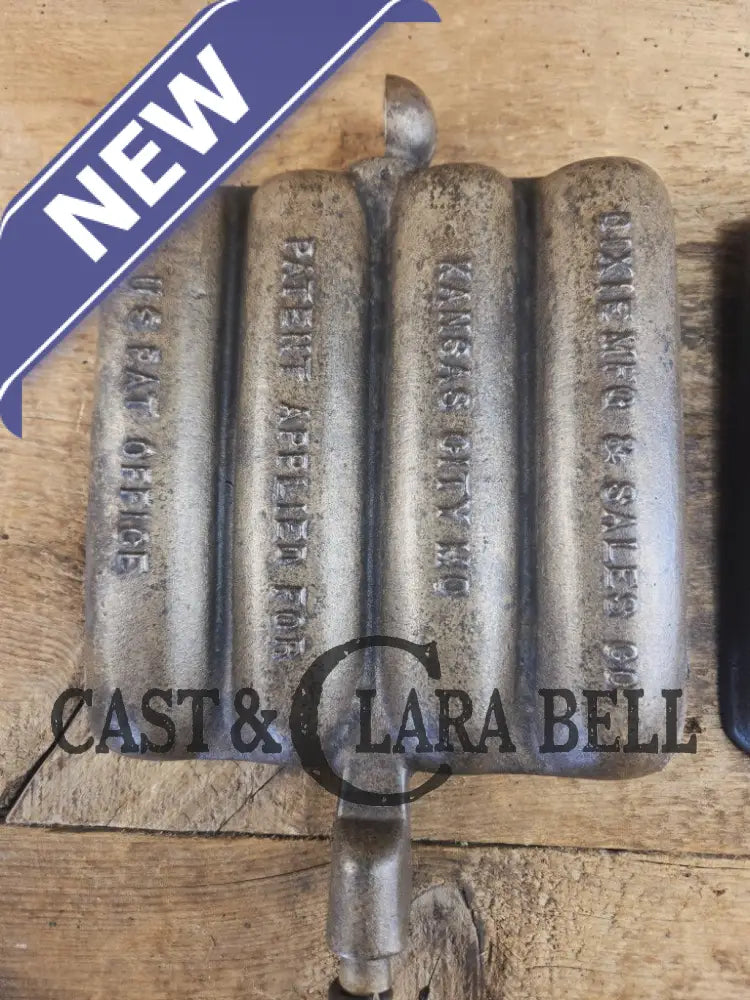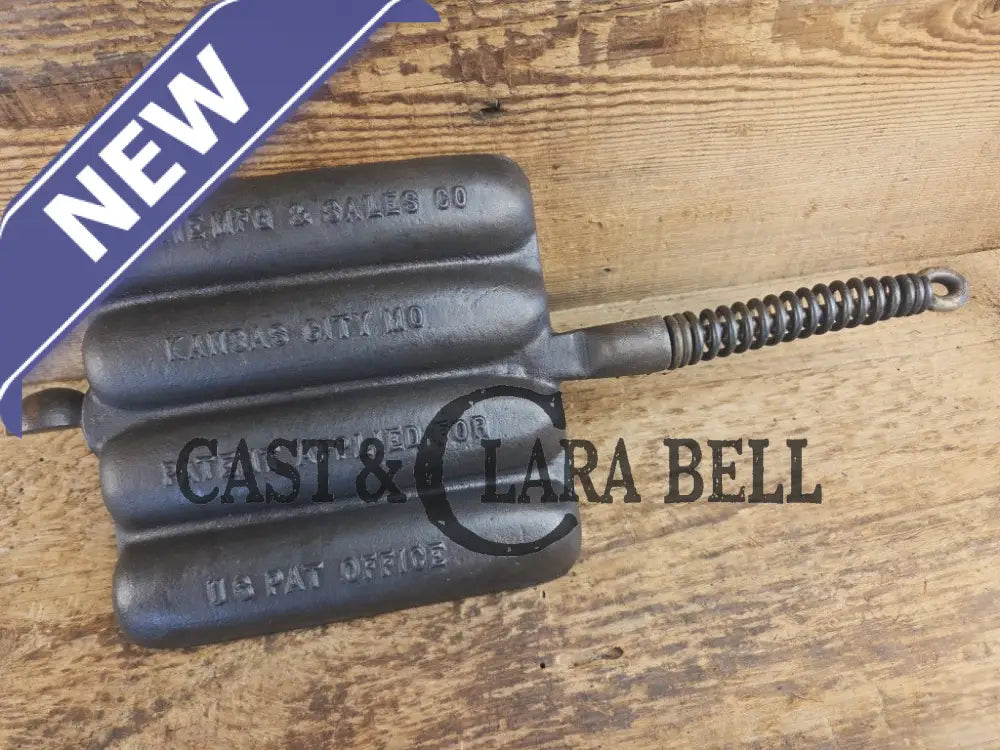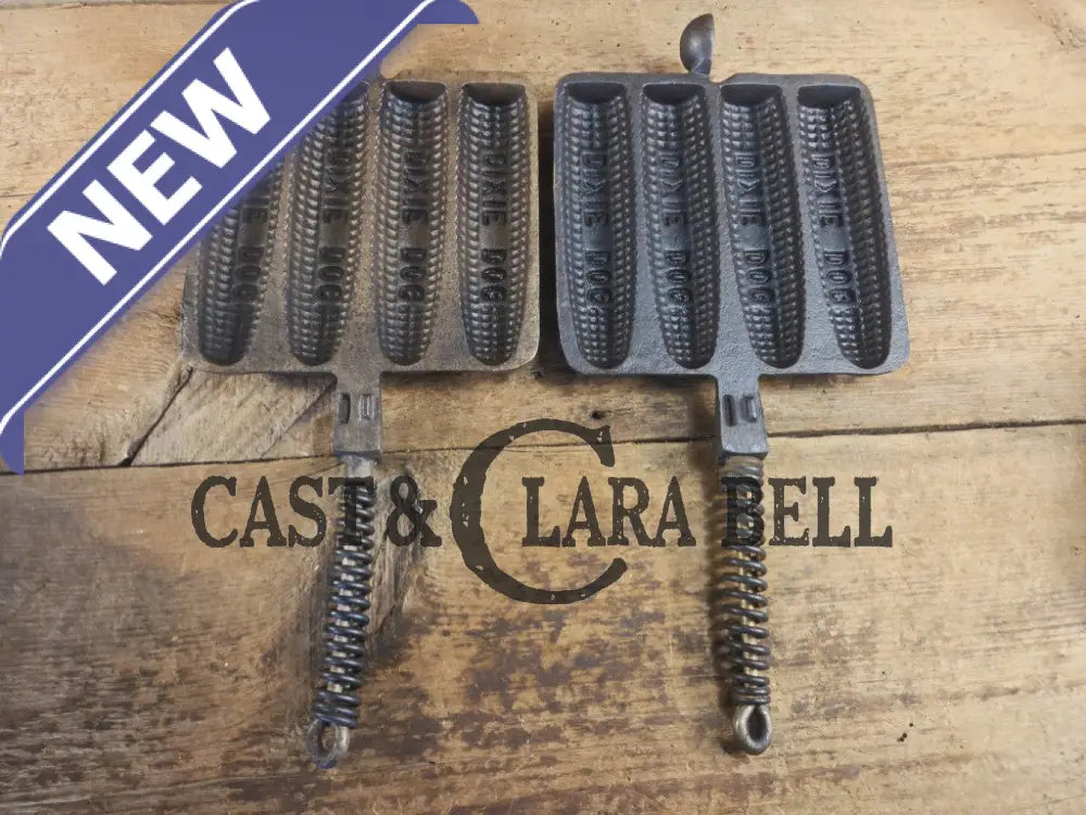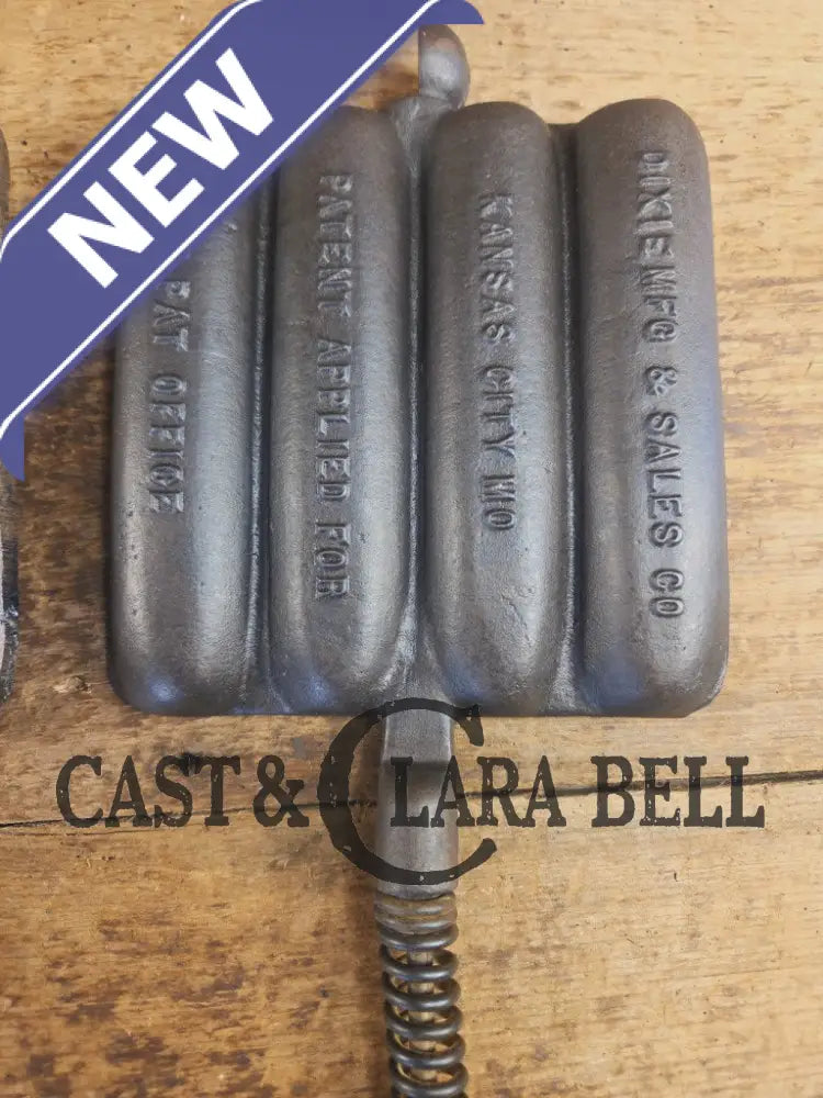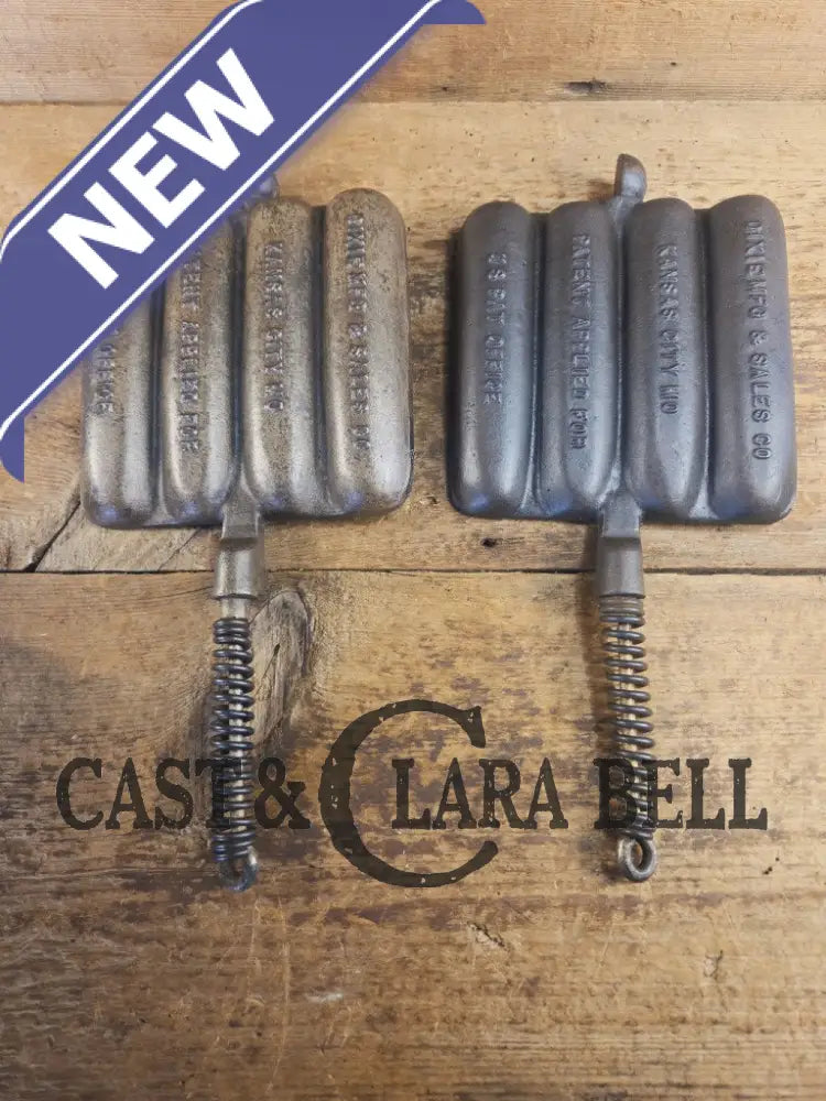 What a cool corn dog waffle iron to have! This piece came to us for a full restoration and we tried to keep as much of the original japanning on it that we could. The paddles and base are in great condition, and have a LOT of life in them. The base reminds us of a Wagner style square iron, and the handles have coil coils. We were super happy with the result, it is a beautiful character piece to have in your gourmet kitchen.