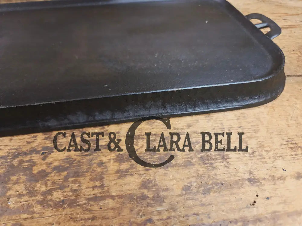This Wagner hammered long griddle from the 30's, came from a collection of a long time southern cast iron collector who had clearly used it on a wood stove. It has some sulfur pitting only on the bottom from being over the stove eye.Β Griswold, Lodge, CHF and a few others made some hammered pieces, but the Wagner griddles are tough ones to find.Β They weren't made long so there is a scarcity to finding one.Β Being over 100 years old, we couldn't believe how well this griddle cleaned up. It has been stripped fully down before being seasoned three times. It sits flat and performs beautifully on the stove top. The Wagner foundry from Sidney Ohio made these griddles just after the turn of the century, and it's story can continue now with you!Β