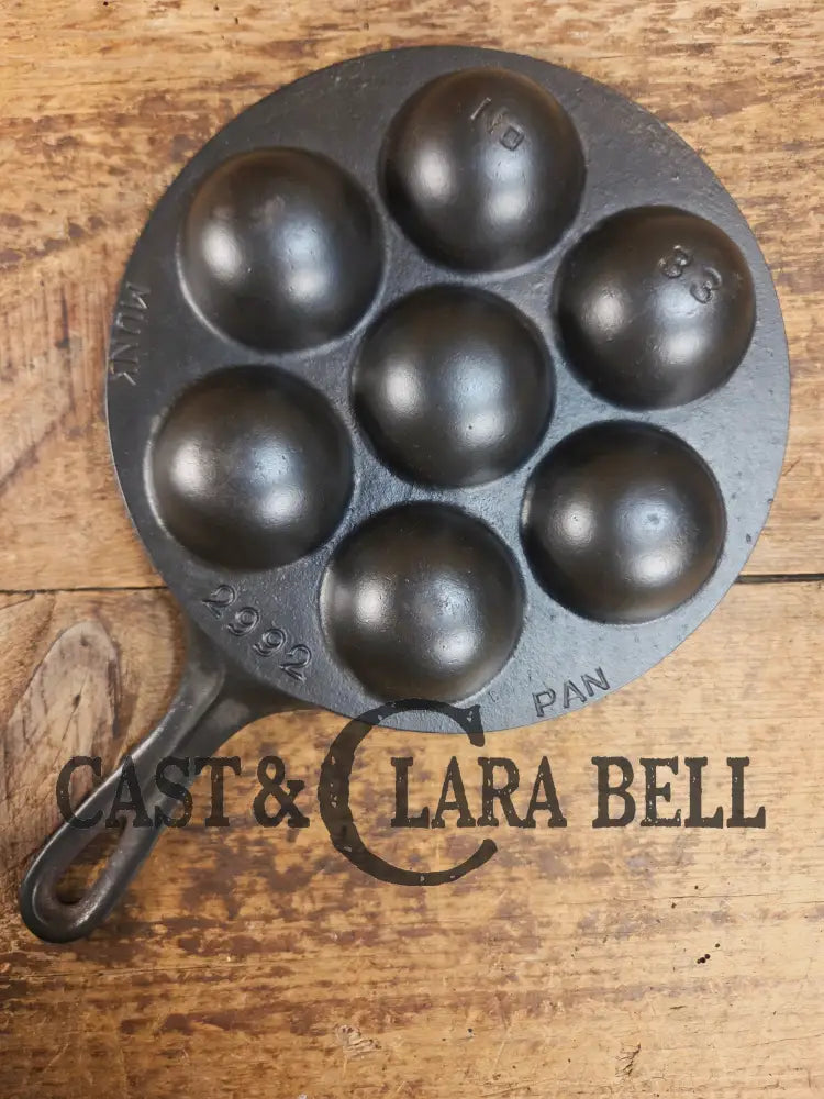 This Danish style Aebleskiver, called a 'Munk' pan, made by Griswold, is one of a few variations made by the famous foundry. There are multiple versions of Aebleskivers, and the most prized are the fully marked ones like this. The markings are both incised and raised and it is in great condition. It sits flat and has no damage visible. It has been restored and seasoned three times with our blend, making it ready to use once you receive it. A one of a kind!Β