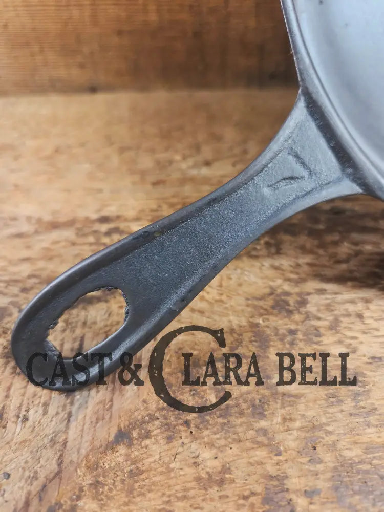 Background on Gate Marking: Gate marking is a term used in describing pieces that were cast prior to very early 1900, when gate mark casting became obsolete. Many foundries during this time are considered "no name" or "unknown" foundries, and produced cookware locally without consideration a future need to know their origins! So while its virtually impossible to know the exact date and location of their creation, they were most likely manufactured in the mid atlantic/ohio area. However this is a best guess at best! This pan has been restored and seasoned three times in organic beef tallow. Its got a cool handle reminiscent of the fancy handles, and is a great piece to cook with OR to display in your gourmet kitchen.