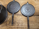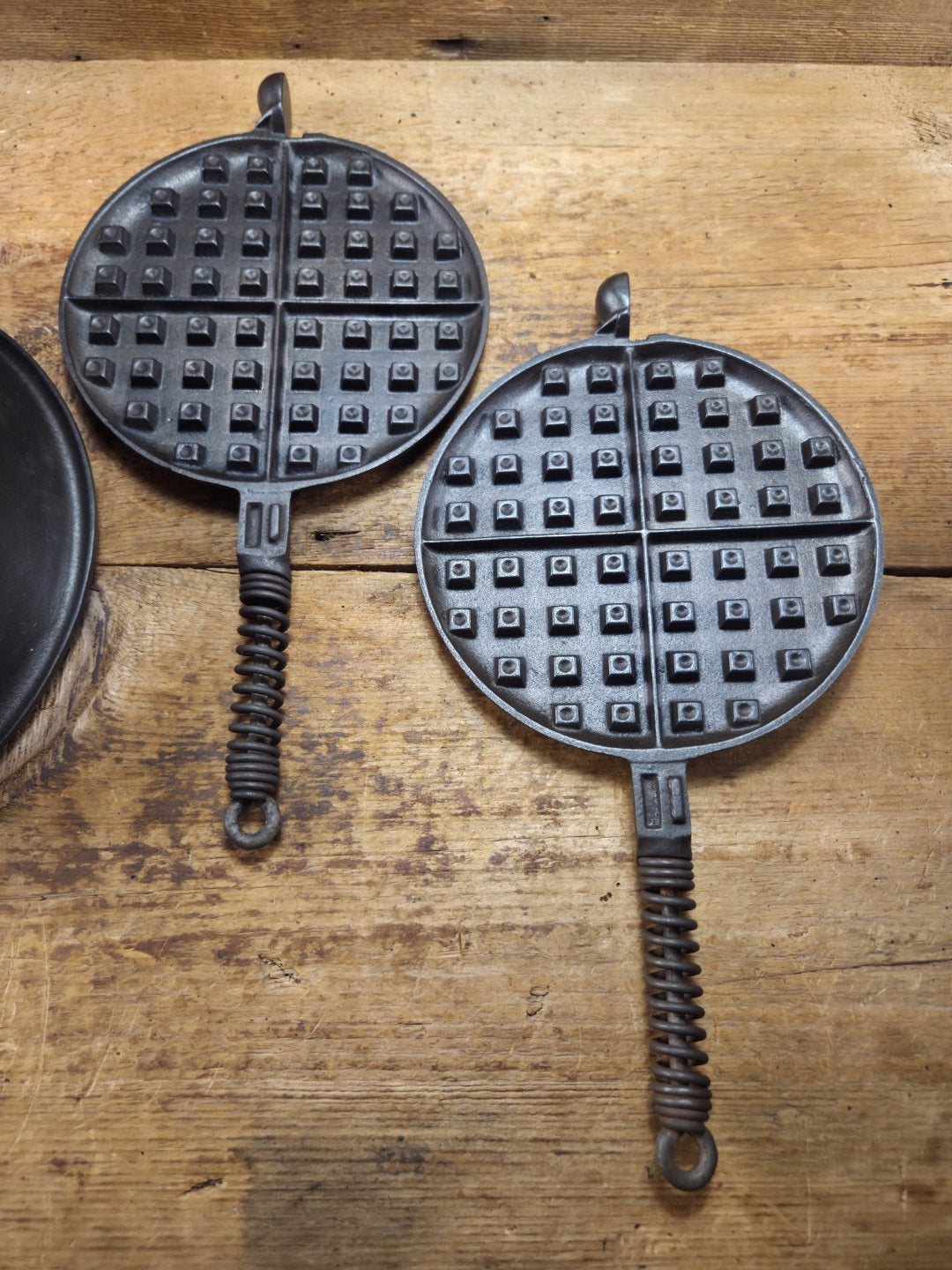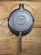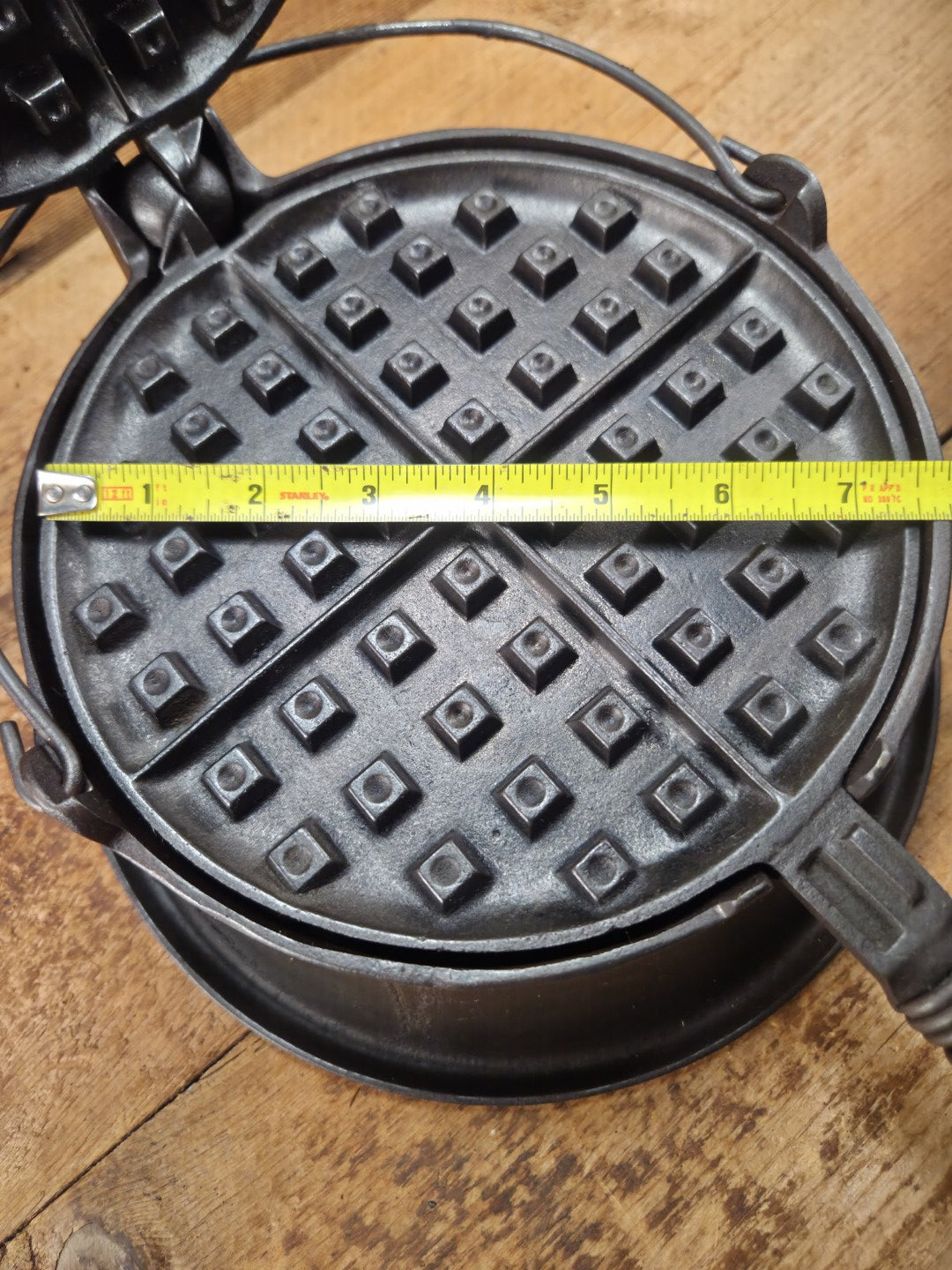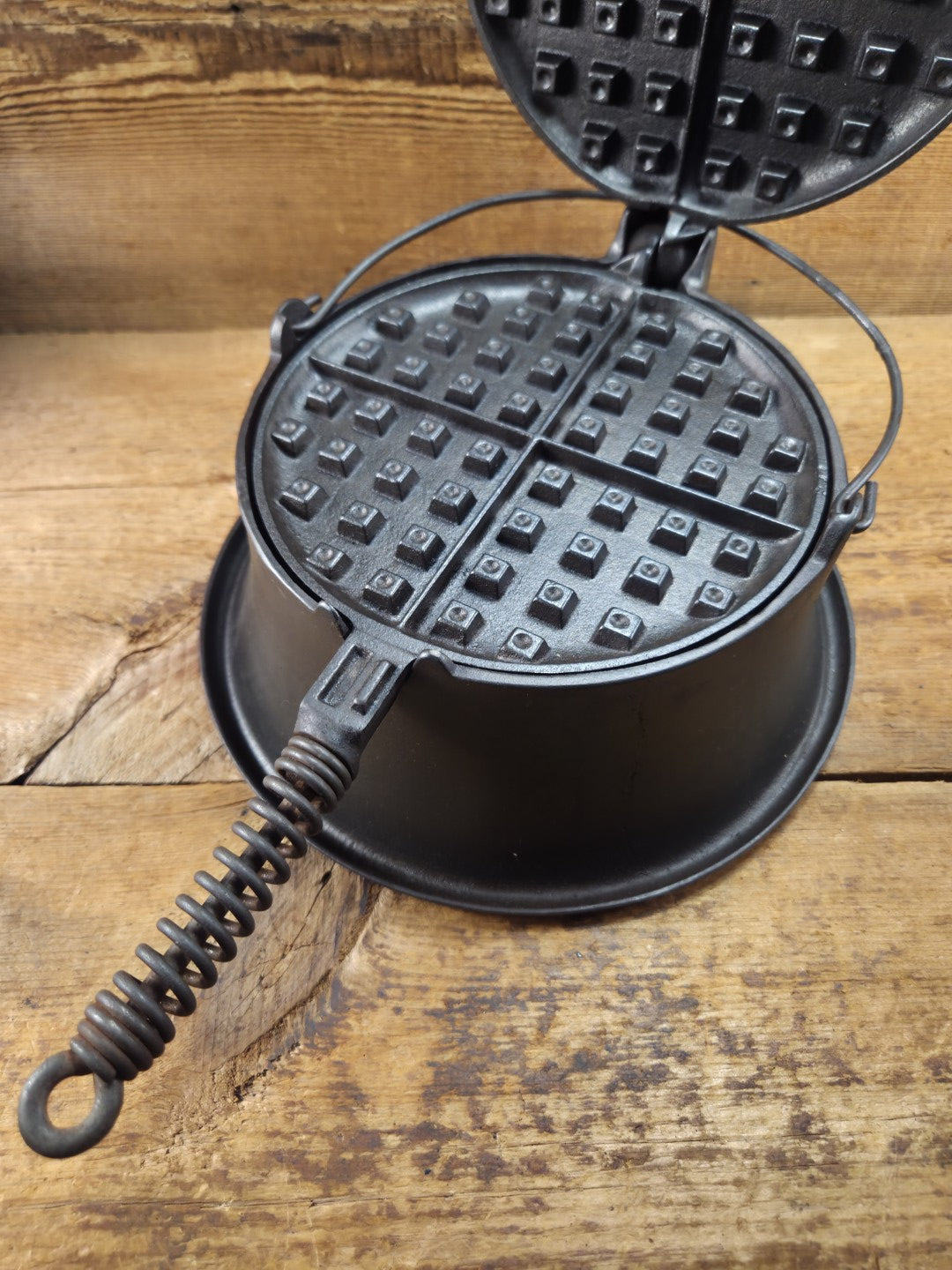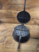 This waffle iron was brought to us from upstate PA. The tall bases are perfect for any cook surface especially gas! For being 100 years old, its in great shape and is a beautiful character piece to have in your gourmet kitchen. It's from the WagnerWare days, when the Wagner cast iron name was replaced with the WagnerWare principal name. It's a hard to find piece that you'll love having at home! Tall bases are a blessing to have for all cook surfaces including out on the campfire because they allow for quick turning on any surface.