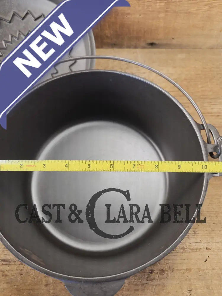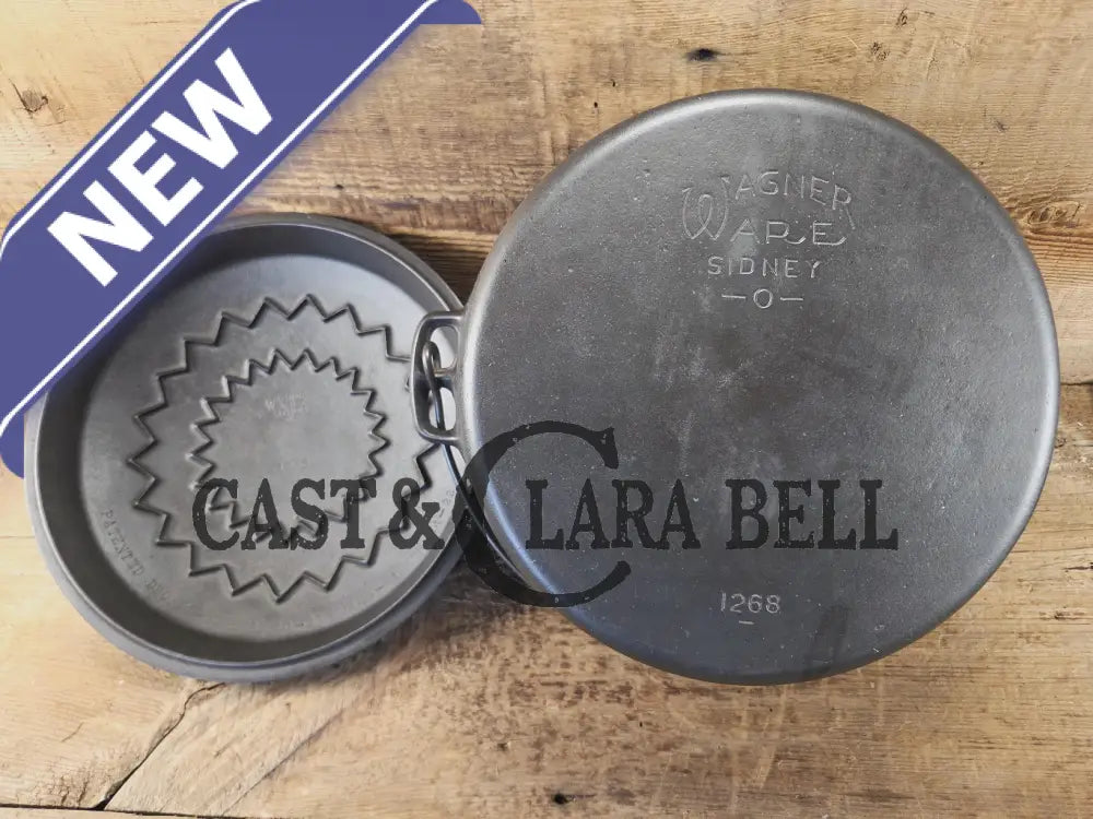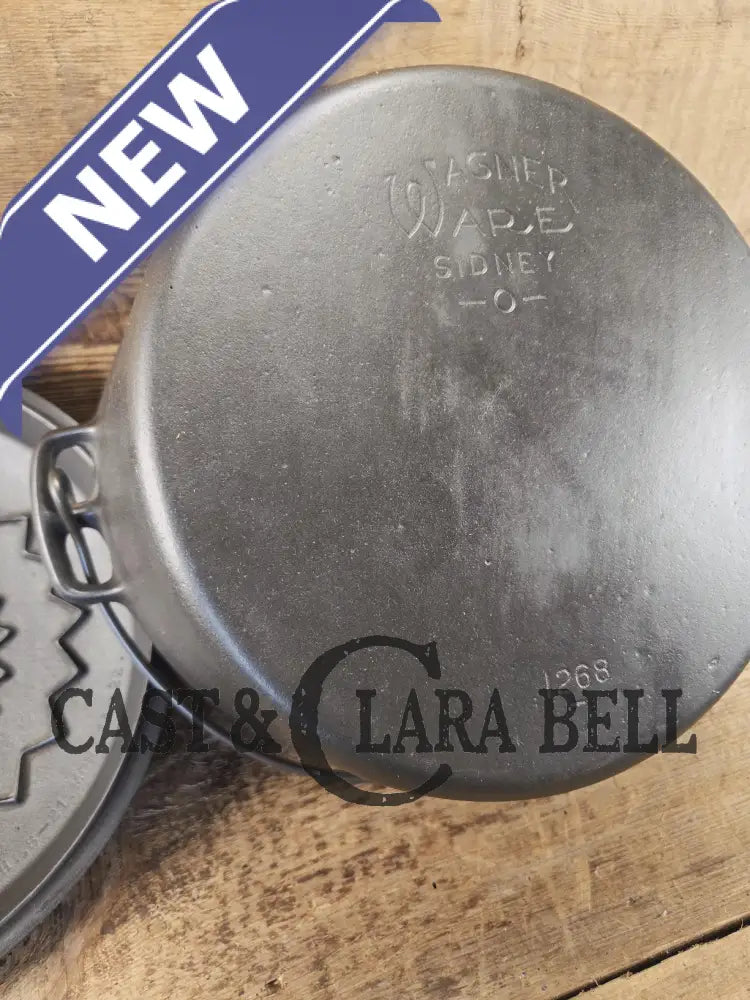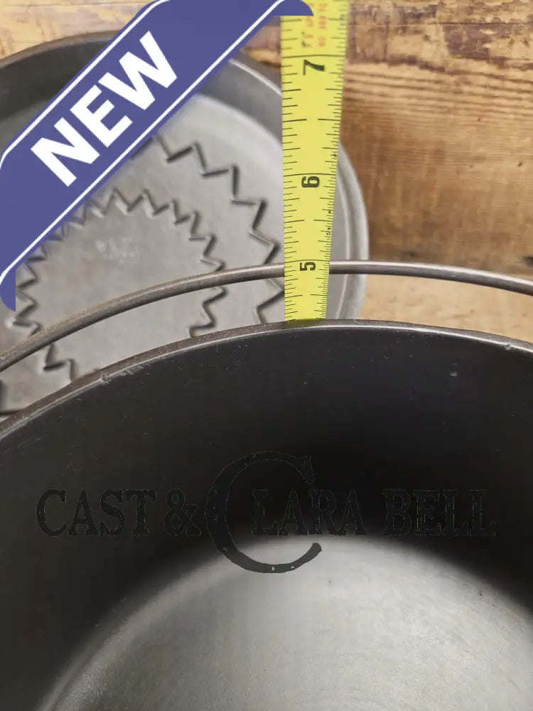 This beautiful 1268 Wagner #8 Dutch Oven has been restored and seasoned three times with our custom oil blend! Its a wonderful show piece and a fantastic tool for your savory soups and chili‘s. This dutch comes with the 1268 B ringed top, sawtooth matching lid as well. There is a lot of discussion around the "flatness" of holloware pieces, because so many of them were not made with concern for flatness back in the early 1900‘s. So it‘s a relatively new concern, and this one, like most Wagner dutch ovens has some spin to it. It does NOT sit perfectly flat, so if you are going to be using it on the stove top and have glass, it will work fine, it has about 80% contact at all times. However we suspect that most of its use will be on a campfire or in your oven!