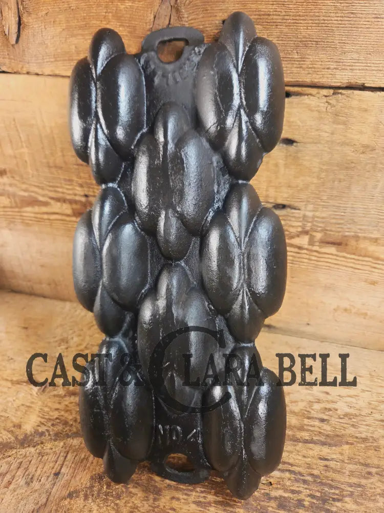 This gorgeous gem pan is one of the hardest to find and like all Filley's is a creatively fun piece of bakeware. G.F. Filley made some of the most creative bakeware and waffle irons that existed from this era. Creative shapes and wonderful raised lettering make it a very attractive piece to have in your collection.Β This one, often referred to as the "hot dog" gem pan is awesome for curious confections as well as an hors dβoeuvres server during the holidays.Β Β