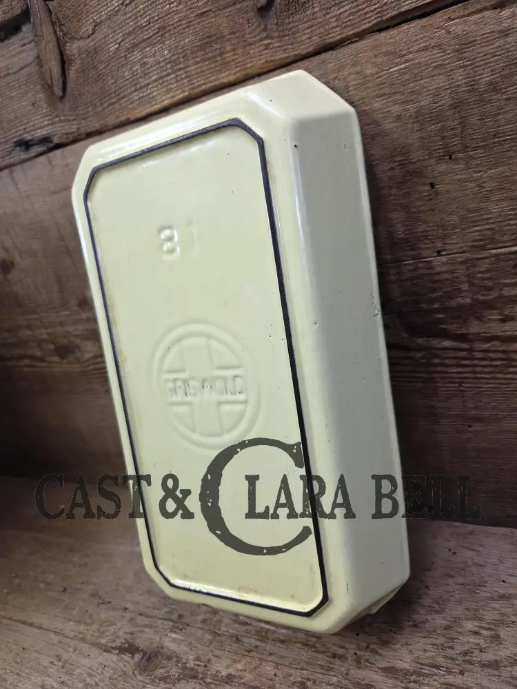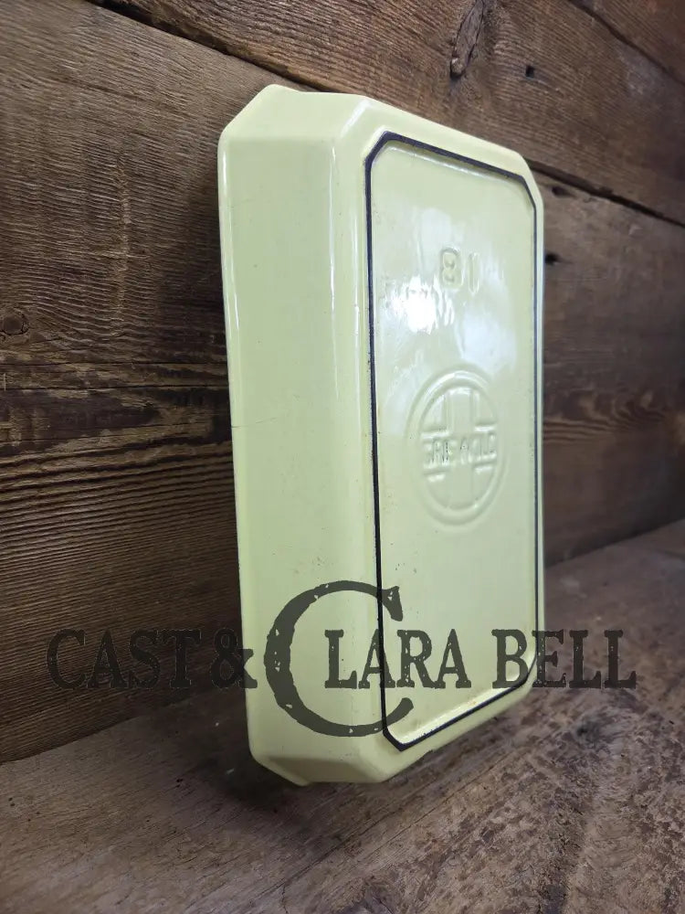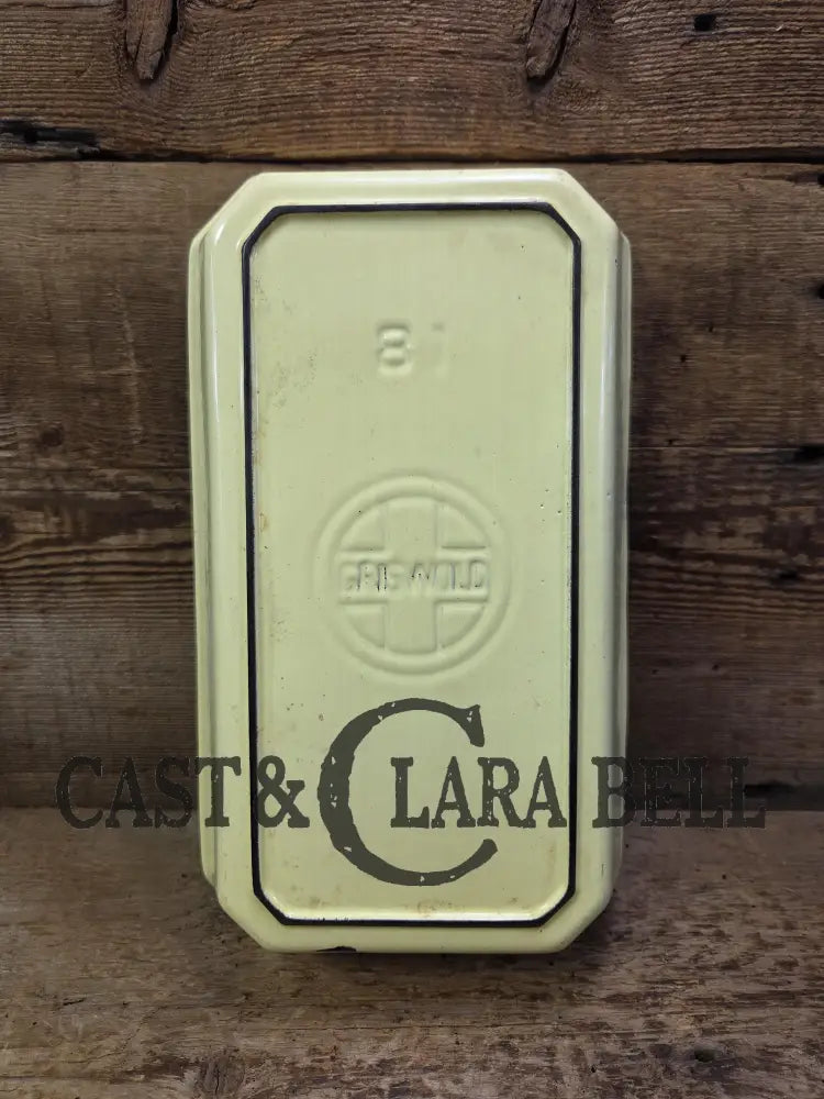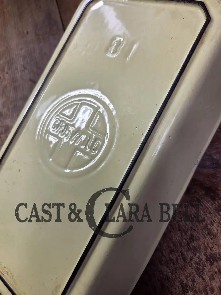 Very cool and a tough one to find! This is the "Yellow and Cream" Series enameled edition of the #81 Casserole Dish. These pieces were made in limited sets and colors in the 40‘s from a number of companies. The enameled cookware very often has much of the enameling gone or chipped. There is a chip at the bottom of one of the long ends, but not much else after that. Very good shape! The dish accompanies a series of skillets, serving pots and service ware. Really cool piece to own!
