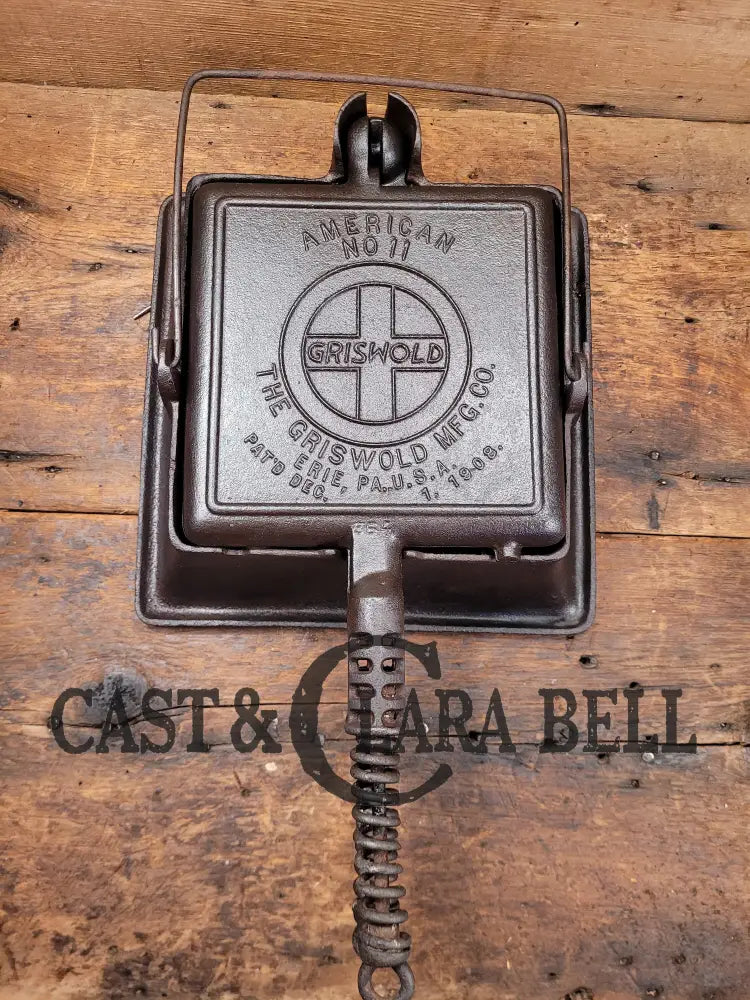 Elegant HTF 1920's Griswold #11 Square Waffle Iron with Slant Block Logo and Tall Base
