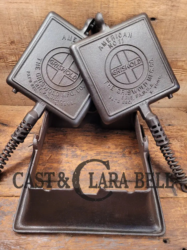 This is a hard to come by piece that we will miss when it goes. These waffle irons sell for much more because they don't come around often, and rarely in this good condition. We fell in love with its square shape and slightly thinner waffles. It's just an elegant piece of American history that you will love in your kitchen. Can't recommend one more! The paddles have the mark of #11 and on the bottom of the base #11D. The base and handles have some pitting which is very common of these since they were used over wood burning fires for so long in their lives. But it is fully restored and ready to cook!