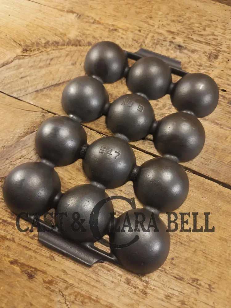 We‘ve sold a few of the "Brownie Style" cast muffin pans as they are amazing to use in the kitchen. Truly one of our favorites to use as well. This gem pan, the 5th of 6 variations (Griswold front, double markings on back) of the brownie pan, is in like-new shape. In the early 1900‘s Griswold began making a whole extended line of bakeware. Many had multiple versions, usually starting with a lesser marked version and becoming more ornate. This 5th version is not seen often. This particular pan has been restored and seasoned three times with our oil blend, and is ready to use. The open-air style of the pan facilitates excellent air circulation for oven baking.