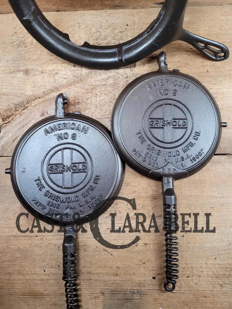 IMPORTANT: This vintage Griswold #8 Cast Waffle Iron has been fully restored and seasoned and is ready to start making some amazing waffles! We came across this waffle iron from a collection sold to us. One of the ball joint ends has a repair to it. It‘s different from most repairs we‘ve seen, where the work appears very old, almost as if it were done by the factory. We have had a few vintage pieces where repairs were done clearly after damage by the owner. But this one looks almost as if it were original to the piece. That is where our knowledge ends so we leave it to you to decide. It works beautifully but since it isn‘t a collector grade, we have discounted the price to reflect the repair. Take advantage of this great deal! After full electrolysis and restoration using three rounds of our oil seasoning, it‘s ready for the next 100 years of use. Shipping is of utmost importance so shipment comes insured and is carefully packed for the ride.