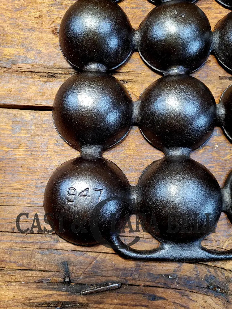 We‘ve sold a few of the "Brownie Style" cast muffin pans as they are amazing to use in the kitchen. Truly one of our favorites to use as well. This #18 gem pan, the unmarked version of the brownie pan with the p/n 947 in bottom left cup, is in like-new shape. In the mid 1900‘s, companies like Griswold, Wagner and Favorite/Piqua made unmarked cookware and bakeware for a variety of reasons. This selling method allowed their brands to be sold in department stores to sell the cookware as their own brand. This particular pan has been restored and seasoned three times with our oil blend, and is ready to use. The open-air style of the pan facilitates excellent air circulation for oven baking.