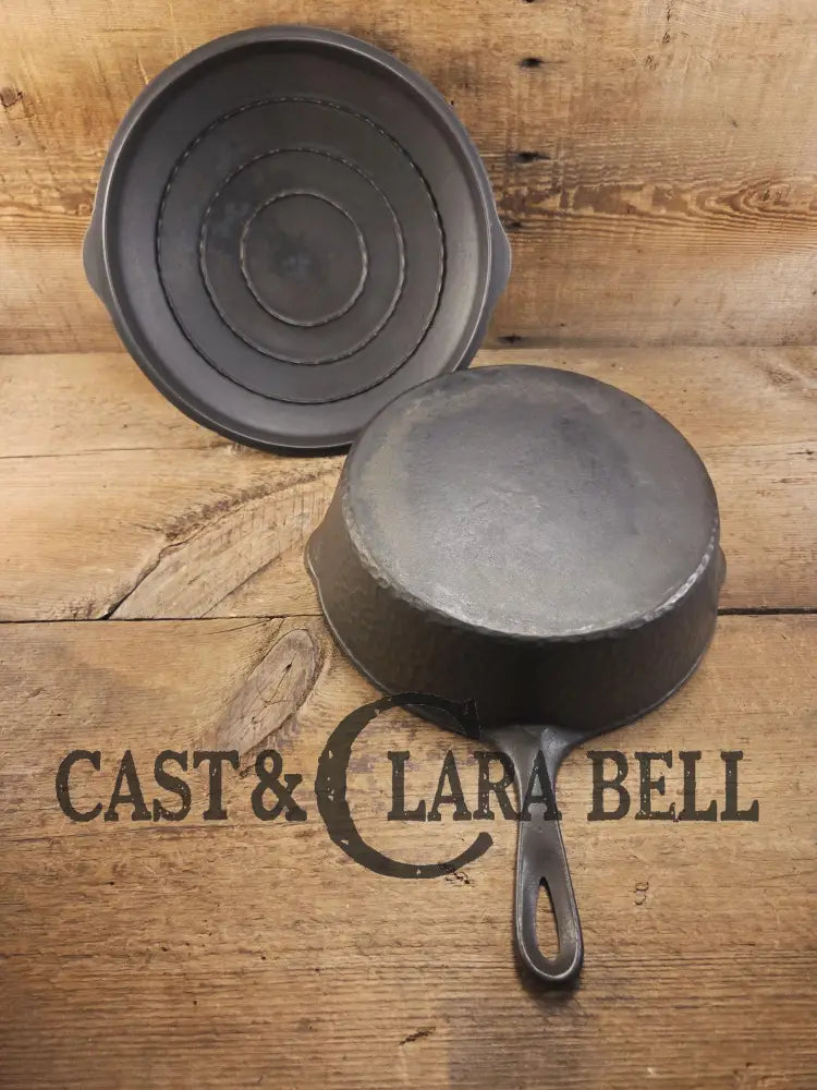 If you‘ve ever owned a hammered vintage piece, you know that the finish is hard to beat. Many of the big names made unmarked CI pieces for department stores, and the hammered finish remains incredibly popular. This particular skillet has been restored and seasoned three times with our own blend and is all ready to get cooking! It is a matching DEEP #9 Skillet with lid, the first we‘ve seen come our way. While it is slightly concave and won‘t sit perfectly flat on a glass surface, its usable. But it is best for gas and electric coil. Keep that in mind when purchasing. Amazing piece to talk about while cooking in your gourmet kitchen!